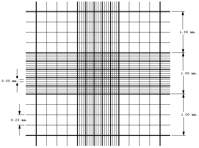 Rulings cover 9 square millimeters. Boundary lines of the Neubauer ruling are the center lines of the groups of three. (These are indicated in the illustration below.) The central square millimeter is ruled into 25 groups of 16 small squares, each group separated by triple lines, the middle one of which is the boundary. The ruled surface is 0.10mm below the cover glass, so that the volume over each of the 16 small squares is .00025 cubic mm.